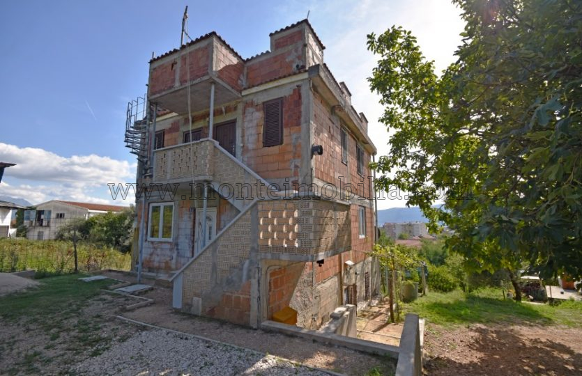 Unfinished family house Bijela center. The house total area 199 sqm, yard 356 sqm and ancillary object 10 sqm. The house is consisted of basement: two bedroom apartment; unfinished ground floor; first floor: two apartments.